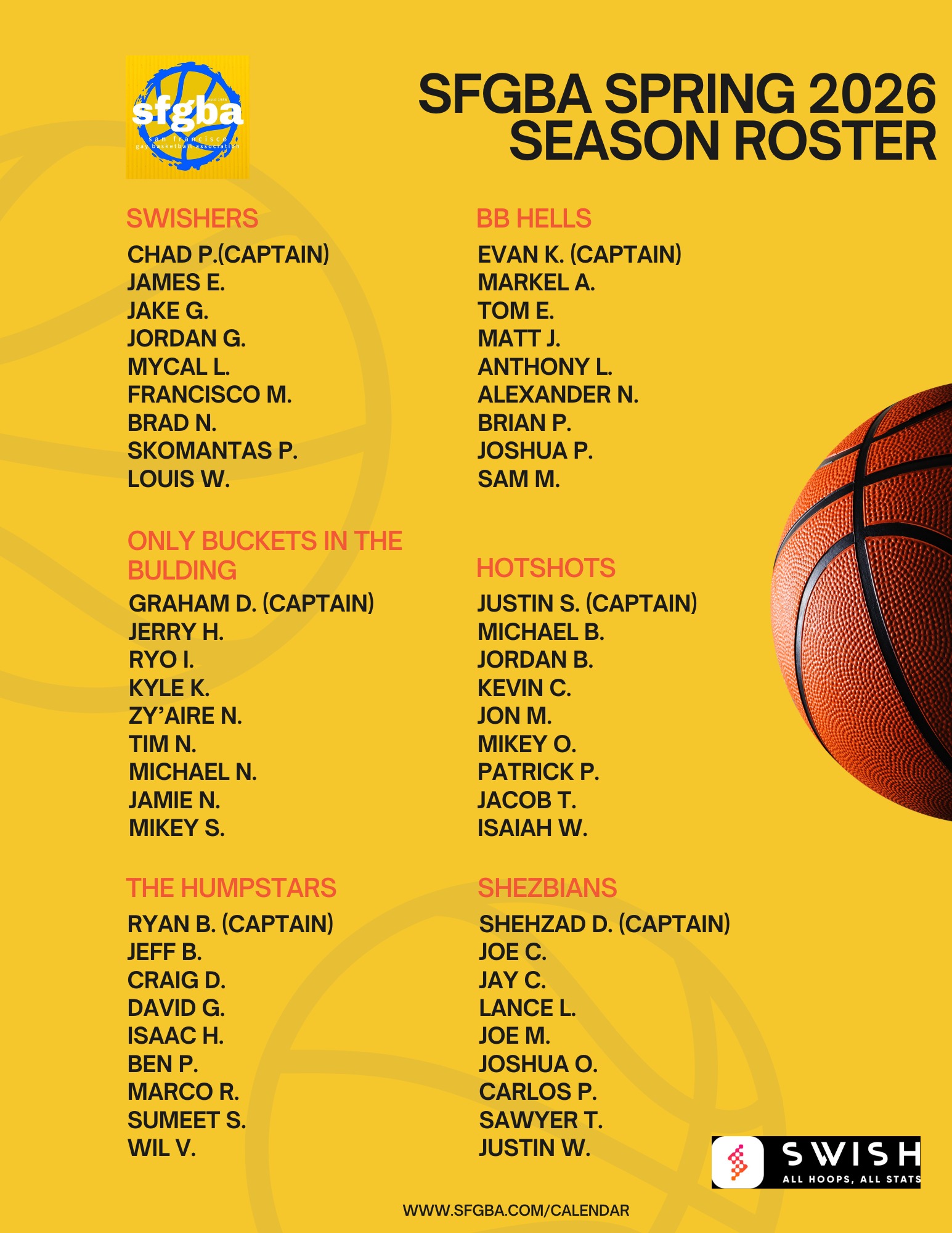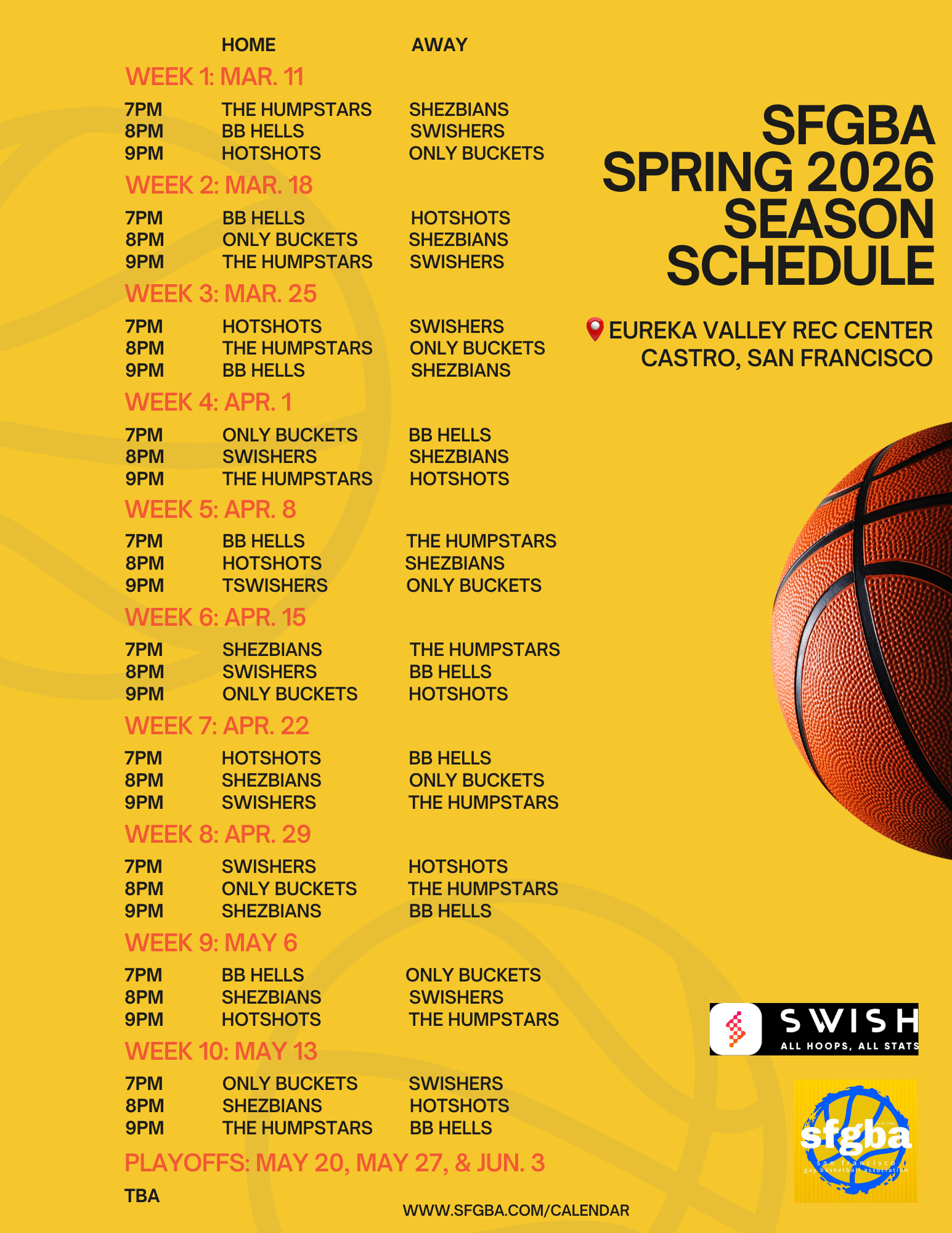 Join us for competition and camaraderie every Wednesday at 7pm, 8pm, and 9pm at Eureka Valley Rec Center in San Francisco’s Castro District. The spring schedule and team rosters are below.